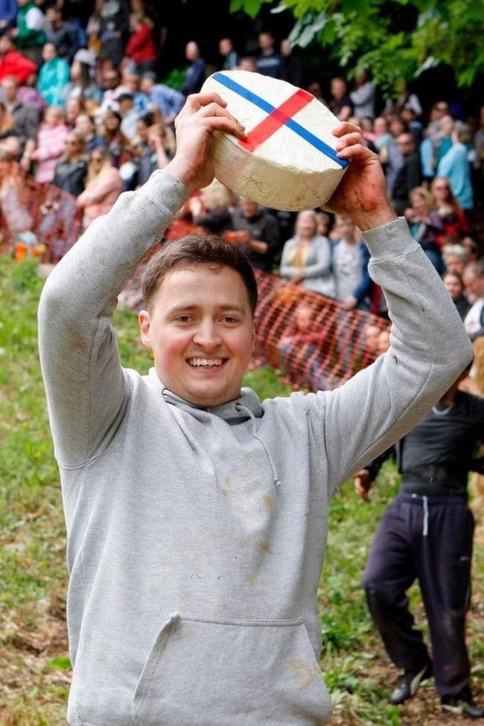 Esta actividad se realizó en Inglaterra en el lugar de Gloucestershire la cual es reconocida como el queso rodante donde tiran un queso rodando por una colina y las personas corren detrás de el. Quien lo logre atrapar se gana un premio.